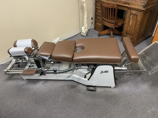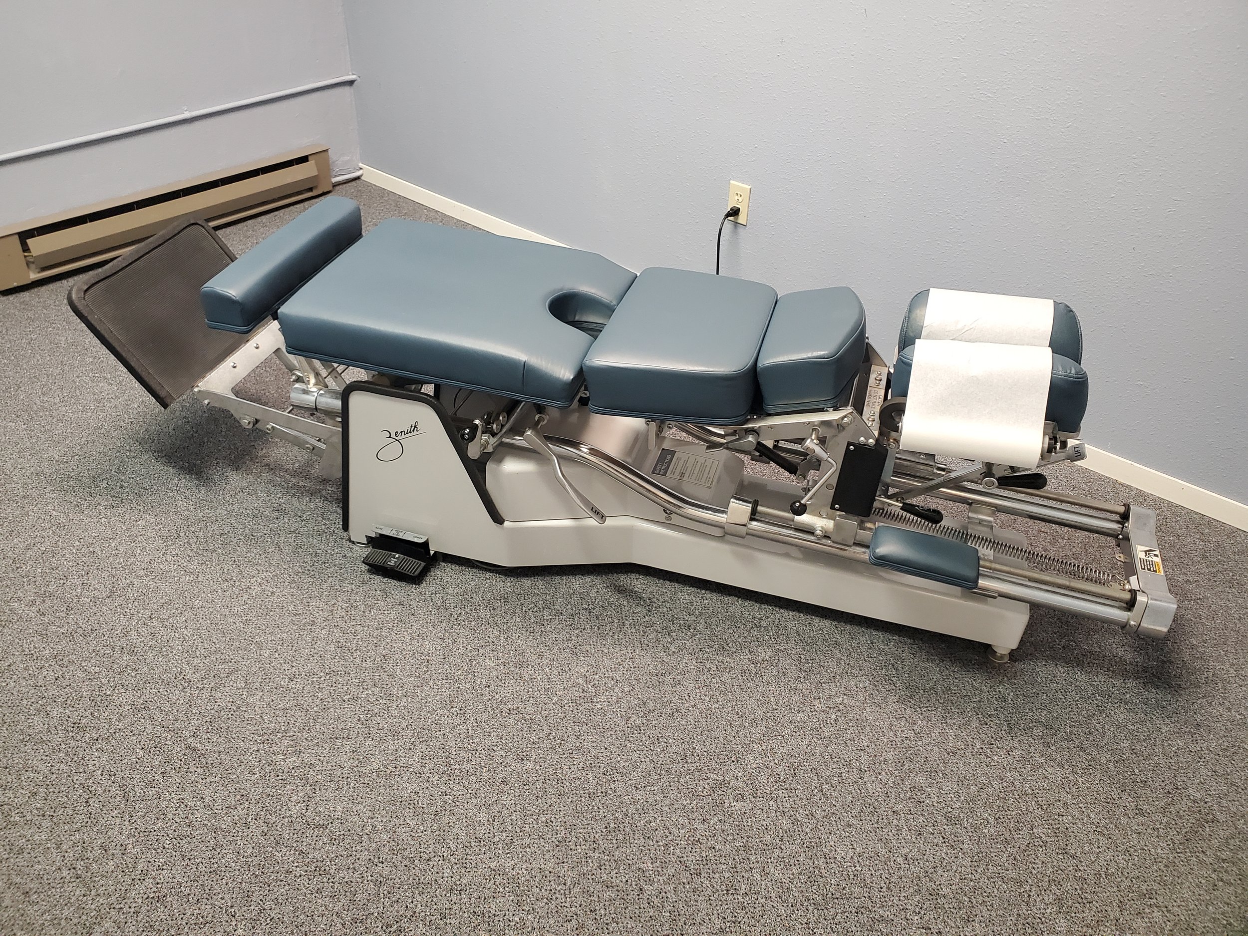 This table is in great, used condition. Built with the quality and usability Zenith is known for, this table is a reliable choice for any office. The table featuresmanual height (adjusts in 2" increments) and manual plane traction to adjust table length. It has pivotal thoracic locks, lateral flexion locks, axial rotation locks that can lock in any position. It also comes equipped with caudal flexion/distraction with leaf spring design with a tension indicator. Upholstery can be changed (buyer chooses desired color from our inventory) before final sale. If you would like more information on this table please contact us by phone or email.